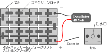バッテリーフォークリフト用48Vバッテリーは、1個「2.1V」のセルが格子状に「24個」直列に連結されています。それぞれのセルがコネクションロッド(平型棒状)により直列接続され、合計48Vとなっています。